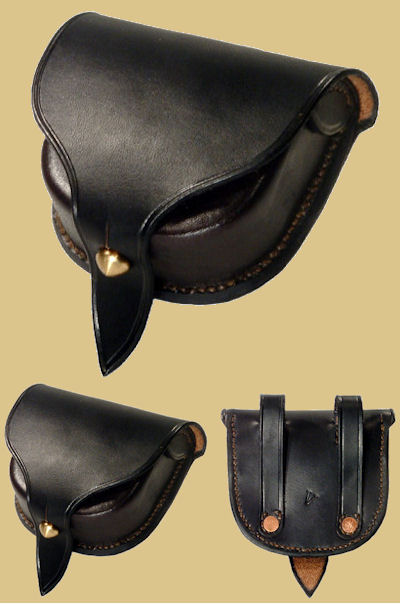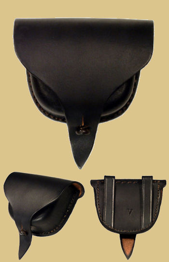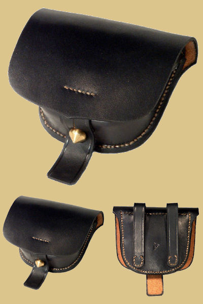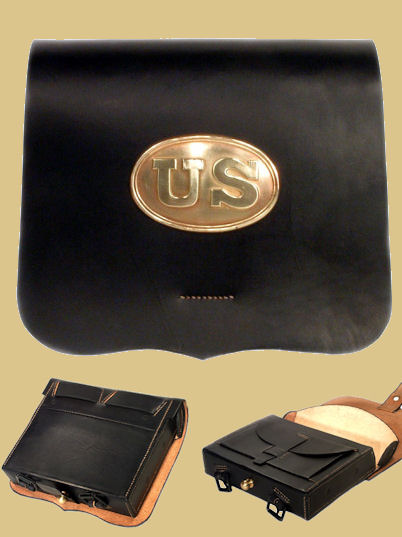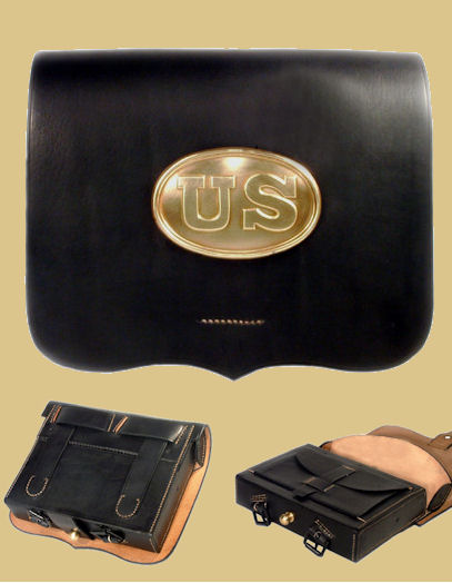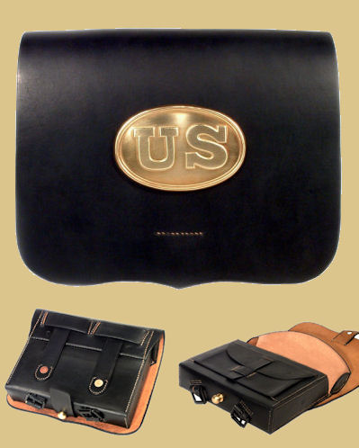 Federal Issue Pattern 1855 Allegheny Arsenal Cap Pouch. The "Shield Front or Full Front" cap pouch (as it is more commonly called) is constructed of blackened oak tanned leather; features a professionally manufactured, rock hard, molded pouch and custom brass finial. Every cap pouch includes a cone pick and small interior cone pick loop as per the original artifacts. Entirely handmade and hand sewn using 19th century leather working techniques. The leather is oiled and greased by hand for long lasting use.