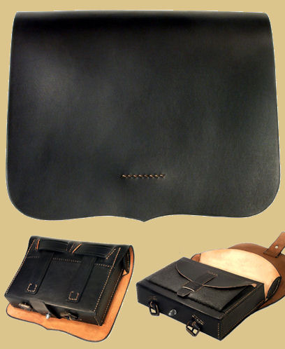 Confederate Issue Cap Pouch. It is constructed of blackened oak tanned leather; features a professionally manufactured, rock hard, molded pouch and a finial which is an antique black Japanned iron wagon tarp button. The large thumbtack looking buttons were used on many different types of accoutrements manufactured in the south during the American Civil War and was present on the original specimen examined. The Confederate Cap Pouch does not have an inner rain flap or a small interior cone pick loop. Entirely handmade and hand sewn using 19th century leather working techniques. The leather is oiled and greased by hand for long lasting use.